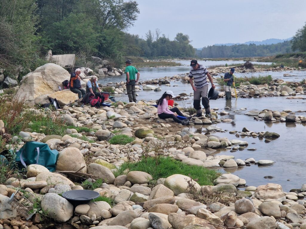 Mein Zelt in Vermogno ist nach einem weiteren Ladestopp bei der Autobahn-Ausfahrt schnell aufgebaut und ich fahre nach Borriana, wo die Schweizer Goldwäscher sich treffen wollen. Ich stelle fest, dass dieses Jahr eine wahrliche Schweizer Invasion nach Italien gekommen ist – offenbar ähnlich wie nach Elvo-Hochwassern. Die Italiener erzählen, dass sich dann ganze Schweizer Goldwäscher-Armeen am Fluss tummeln.