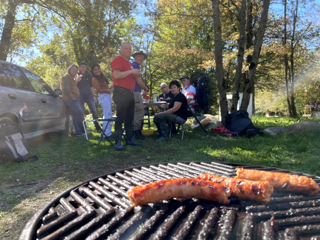 Unschlagbar dagegen unser Mittagessen: Wurst am Meter, organisiert von Silvia, gegrillt auf Sepp’s Camping-Grill. Goldwäscherküche – einfach, sättigend, und niemand bleibt hungrig.